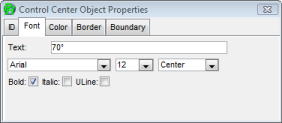 Click on the “Font” Tab and enter text for your new label. Since this button will set the STAT to HEAT-70 degrees, and the control button is already colored red to signify “heat,” let’s label it simply “70°”.   Also select a font, font size, and alignment style (the default “Center” usually is best). To make the label stand out use a font size of 12 and make it BOLD.